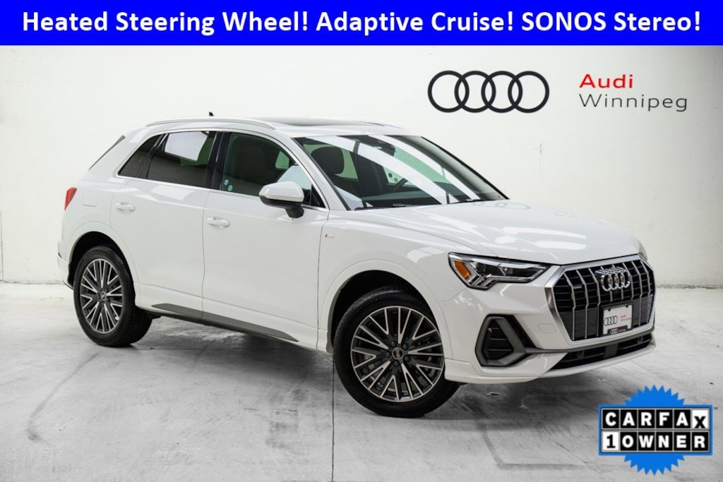 Get noticed in this beautiful Glacier White Metallic SUV! Treat yourself to the features you deserve in this low KM 2023 Audi Q3 with Quattro All-Wheel Drive that just arrived on trade in top of the line Technik trim! This compact SUV has a plethora of factory warranty remaining plus a very long list of features such as: heated leather seating w/driver seat memory, heated steering wheel, a huge panoramic sunroof, top view 360 degree camera system, navigation w/wireless Apple Carplay, premium SONOS sound system power tailgate, blind spot monitoring, lane departure warning and more.