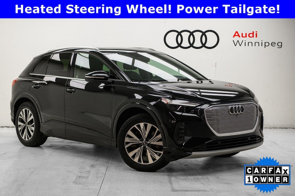 Save over $15,100 from new on this accident-free low KM DEMO 2025 Audi Q4 e-tron 55 with Quattro All-Wheel Drive that just arrived directly from Audi Canada in beautiful Mythos Black Metallic! Lots of factory warranty remaining plus you'll enjoy heated leather seating, heated steering wheel, a huge panoramic sunroof, power tailgate, rear view camera, wireless Apple Carplay & Android Auto, lane departure warning and blind spot monitoring w/rear cross traffic alert. You'll enjoy up to 414km of fully electric driving range!